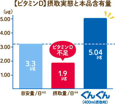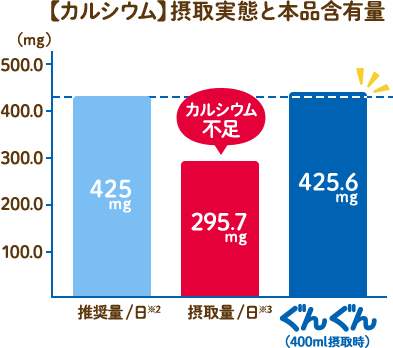 「ぐんぐん」は、食事で不足しがちなカルシウムを、100ml当たり106.4mg配合しており、400ml(コップ約2杯分(fēn))で、1日分(fēn)の推奨量に対して100%※1サポートできます。