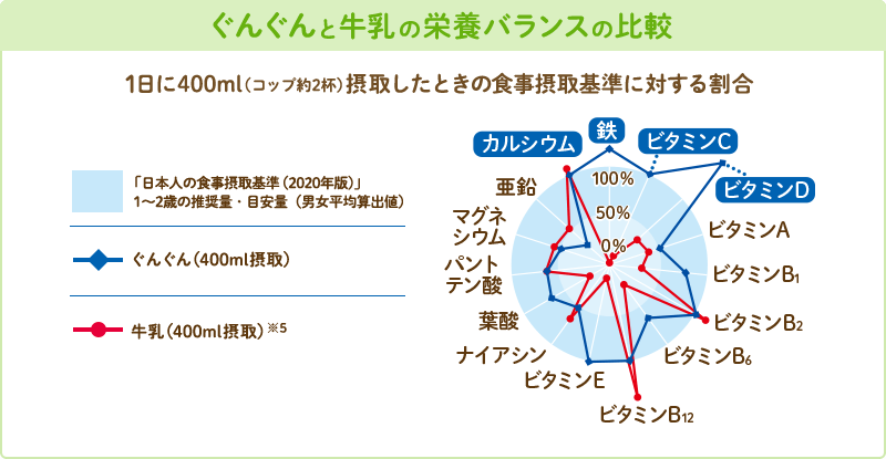 ※1 「日本人の食事摂取基準(2020年版)」1~2歳の推奨量・目安量(男女平均算出値)に対する割合(1日当たり「ぐんぐん」を400ml摂取したとき)