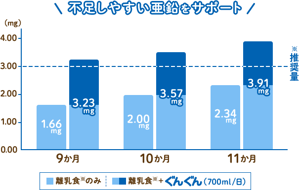 亜鉛は乳児の発育と健康に欠かせない必須ミネラルのひとつですが、9~11か月の月齢では、