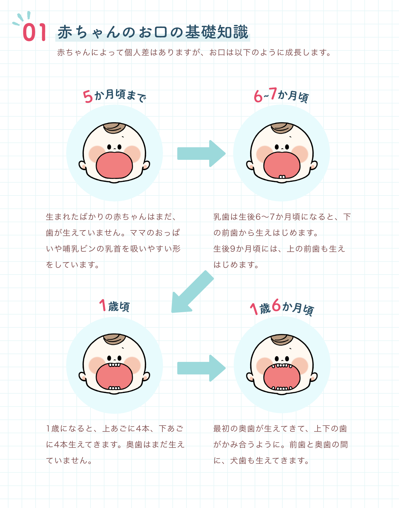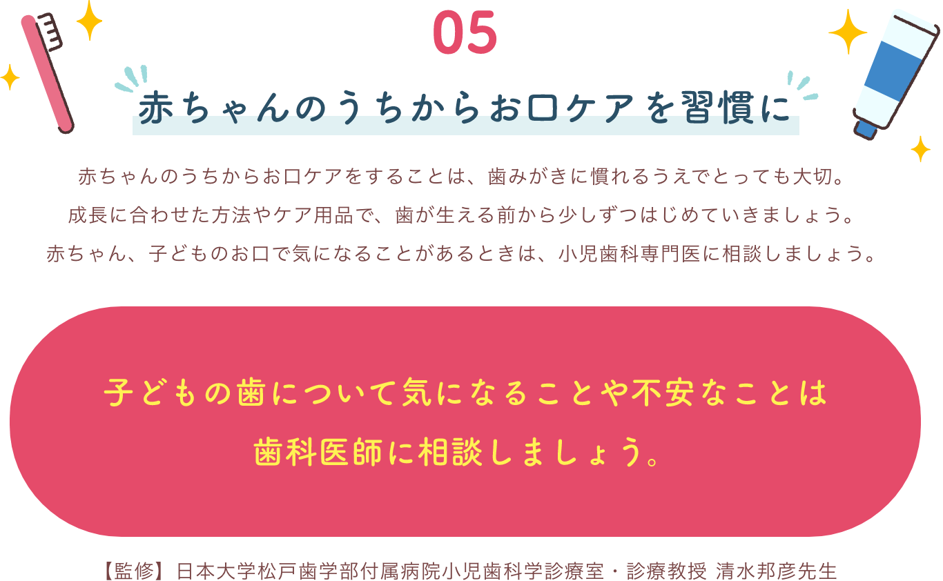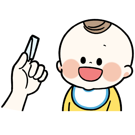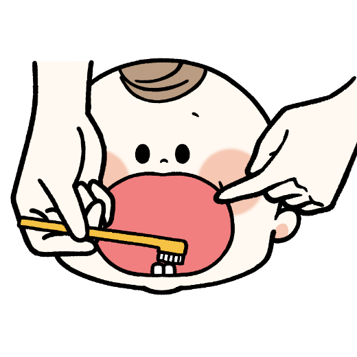 目安は、離乳食が始まったころ(ガーゼや歯みがきシートを舌で押し出すことが少なくなったころ)がはじめどきです。
