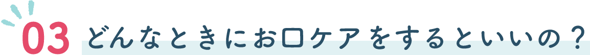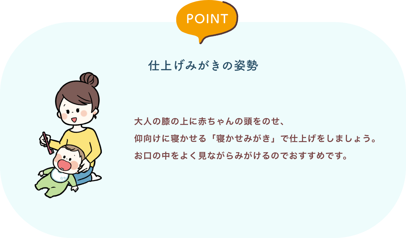 歯が生えて、お口ケアをすることに慣れてきたら、食事やミルクのあとにお手入れをしてあげましょう。食事が規則的になったら、毎食後の習慣となるようにしましょう。
