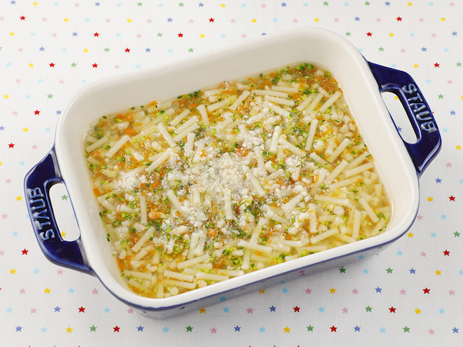 2. にんじん、玉ねぎ、ブロッコリーはみじん切りにし、鍋で100ml(1/2カップ)の水、「手作り応援 コンソメ」、鶏ひき肉と一緒にやわらかくなるまで煮ます。