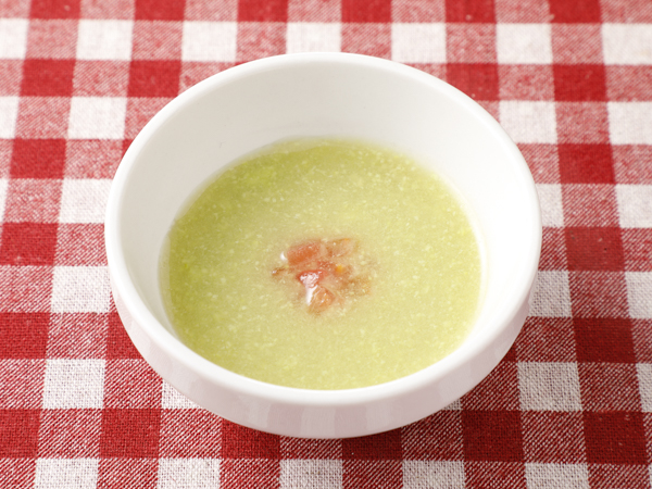 - 器に入れ、湯むきして細かく切ったトマトを盛り付けます。