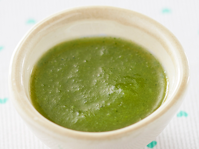 - 「手作り応援 コンソメ」と「手作り応援 ほうれん草(cǎo)と小(xiǎo)松菜」を一緒に15ml(大さじ1杯)のお湯で溶き、よく混ぜ合わせます。